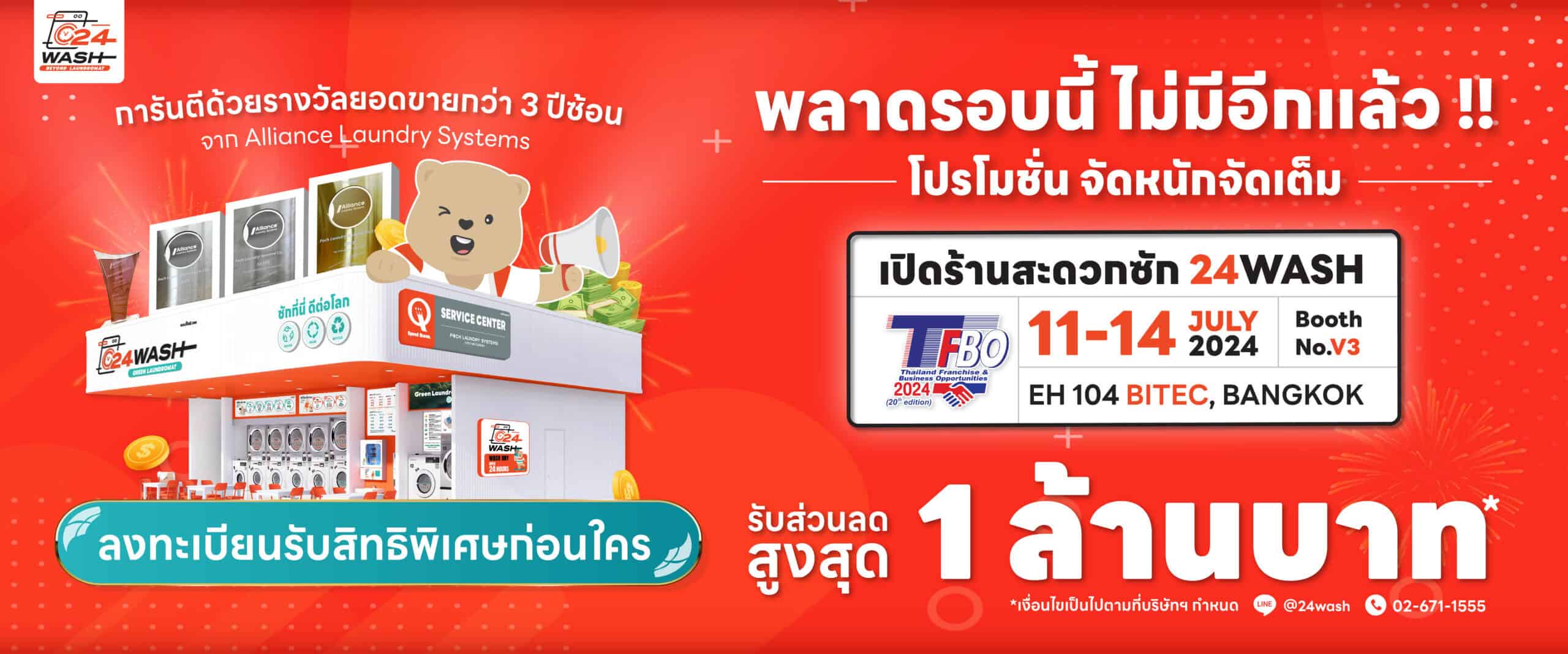 TFBO งานแสดงแฟรนไชส์นานาชาติและโอกาสการเป็นเจ้าของร้านสะดวกซัก 24WASH จัดขึ้นระหว่างวันที่ 11-14 กค 2567 ณ ฮอลล์ EH 104 ไบเทค บูธ V.3