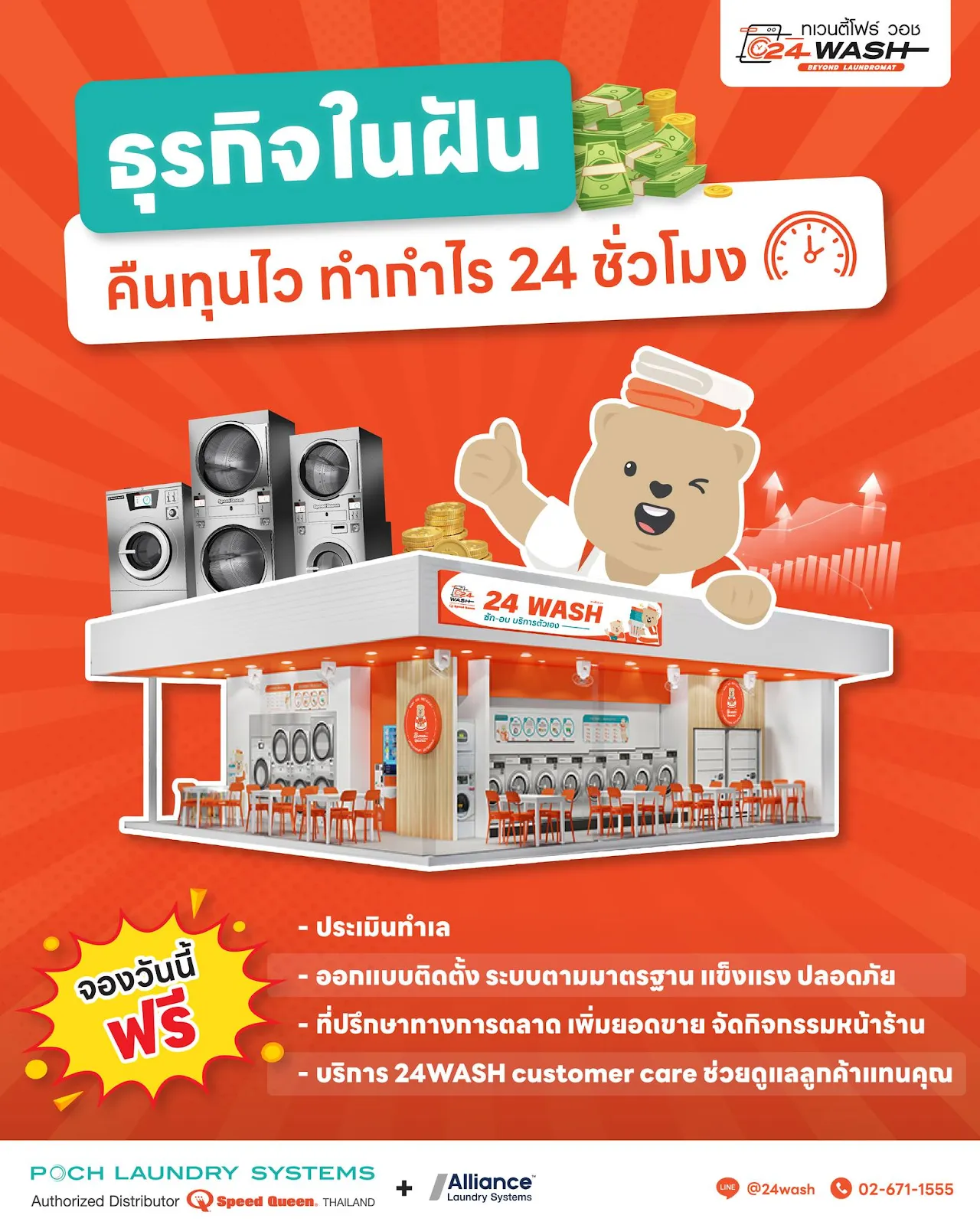 จุดแข็งของแฟรนไชส์ 24WASH ที่เน้นการขายในรูปแบบ B2B ด้วยเทคโนโลยีการซักผ้าขั้นสูง บริการครบวงจร และการสนับสนุนจากผู้เชี่ยวชาญ ทำให้มั่นใจในการเริ่มต้นธุรกิจ